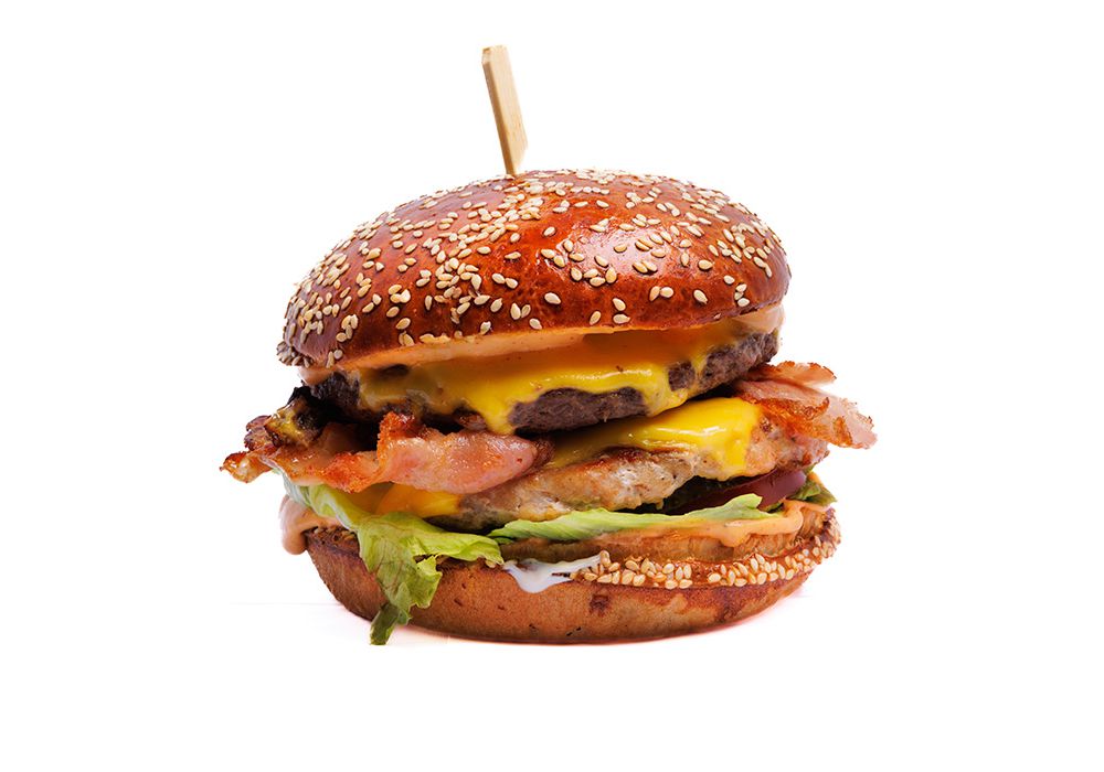Пшенична булка для бургера, куряча та яловича котлети, листя салату, сир чеддер, хрумкий бекон, свіжі помідори, мариновані огірки, карамелізована цибуля, фірмовий соус. Подається з картоплею фрі та кетчупом