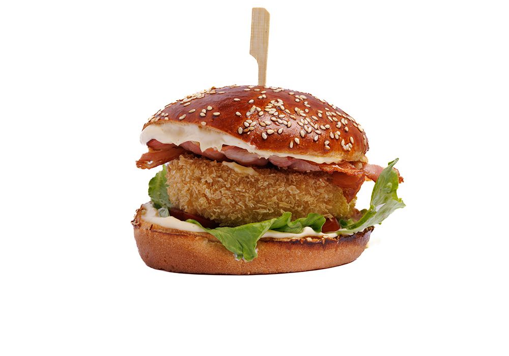 Вага380+100г СкладПшенична булка для бургера, соус «Цезар», томати чері, листя салату, хрумкий бекон, ніжний сир камамбер, смажена цибуля. Подається з картоплею фрі та кетчупом