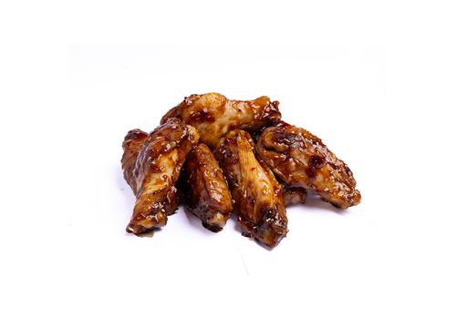 Соковиті курячі крильця, обсмажені до золотистої скоринки, у пряному соусі теріякі з пікантним соусом пішта та посипані білим кунжутом.