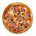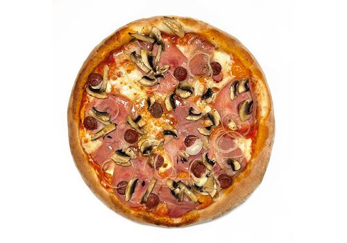 Томатний соус, базилік, бекон, шинка, мисливські ковбаски, цибуля кримська, моцарелла, печериці