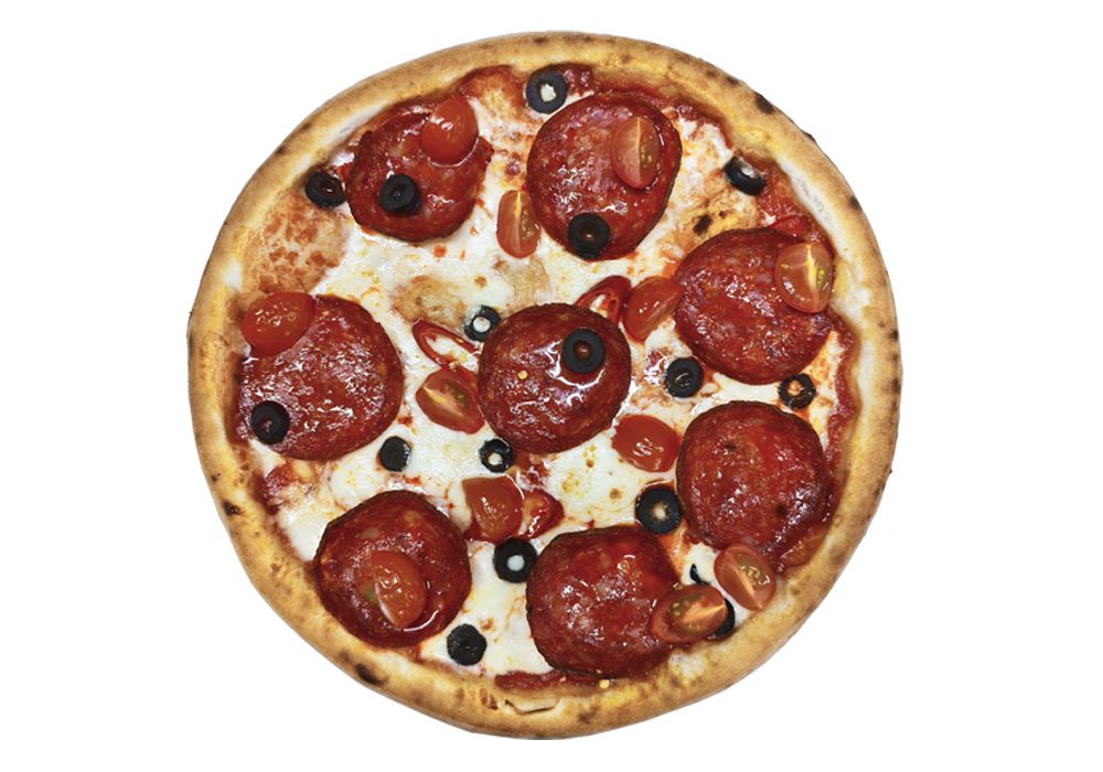томатний соус, сир Моцарелла, ковбаса Чорризо, перець чилі, томати черрі, маслини, оливкова олія, орегано