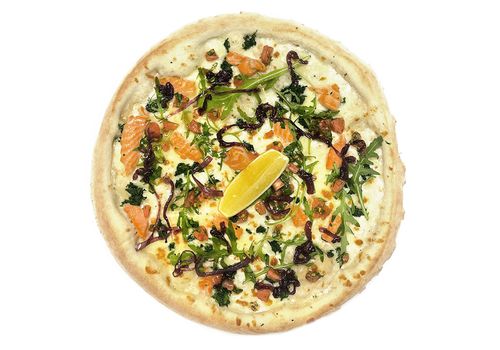 вершковий соус, лосось, шпинат, карамелізована цибуля, лимон, рукола, сир Моцарела, помідори канкасе