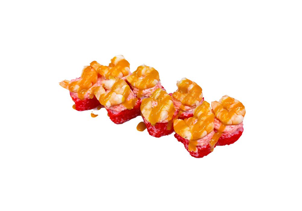 Рис, крем-сир, ананас консервований, ікра масаго, соус сирний, креветка тигрова, пюре манго