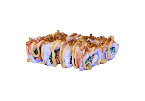 норі, рис, смажений лосось, огірок, крем сир, креветка, сирний соус, смажена цибуля