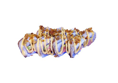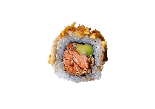 рис, норі, смажений лосось, авокадо, вугор, сирний соус, смажена цибуля
