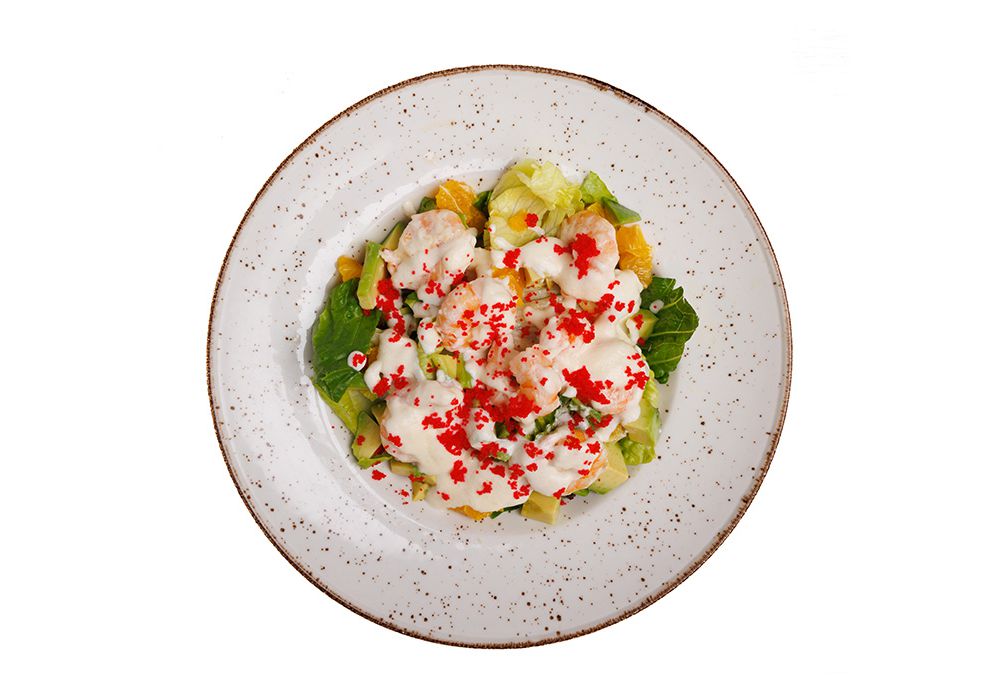 Тигрова креветка, мікс салату, вершковий соус, сир пармезан, сухий часник, авокадо, апельсин, ікра тобіко