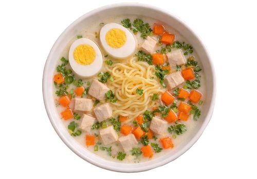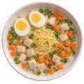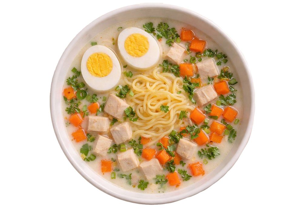 Курячий бульон, морква, яйця перепелині, куряче філе, зелень