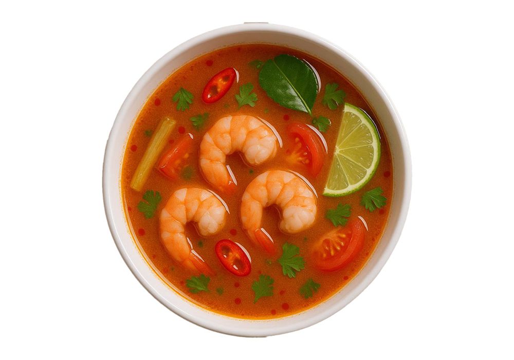 Пікантний тайський суп на курячому бульйоні з кокосовим молоком і пастою том ям. Соковиті тигрові креветки, кальмар-квітка, печериці, чері, ароматні трави та відтінок лайму з рисом створюють неповторний екзотичний смак.