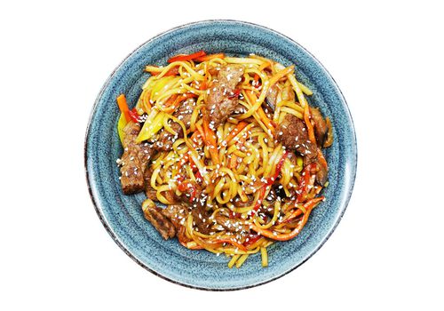 пшенична локшина, цукіні, баклажан, яловичина, цибуля, морква, болгарський перець, соус теріякі, соєвий соус